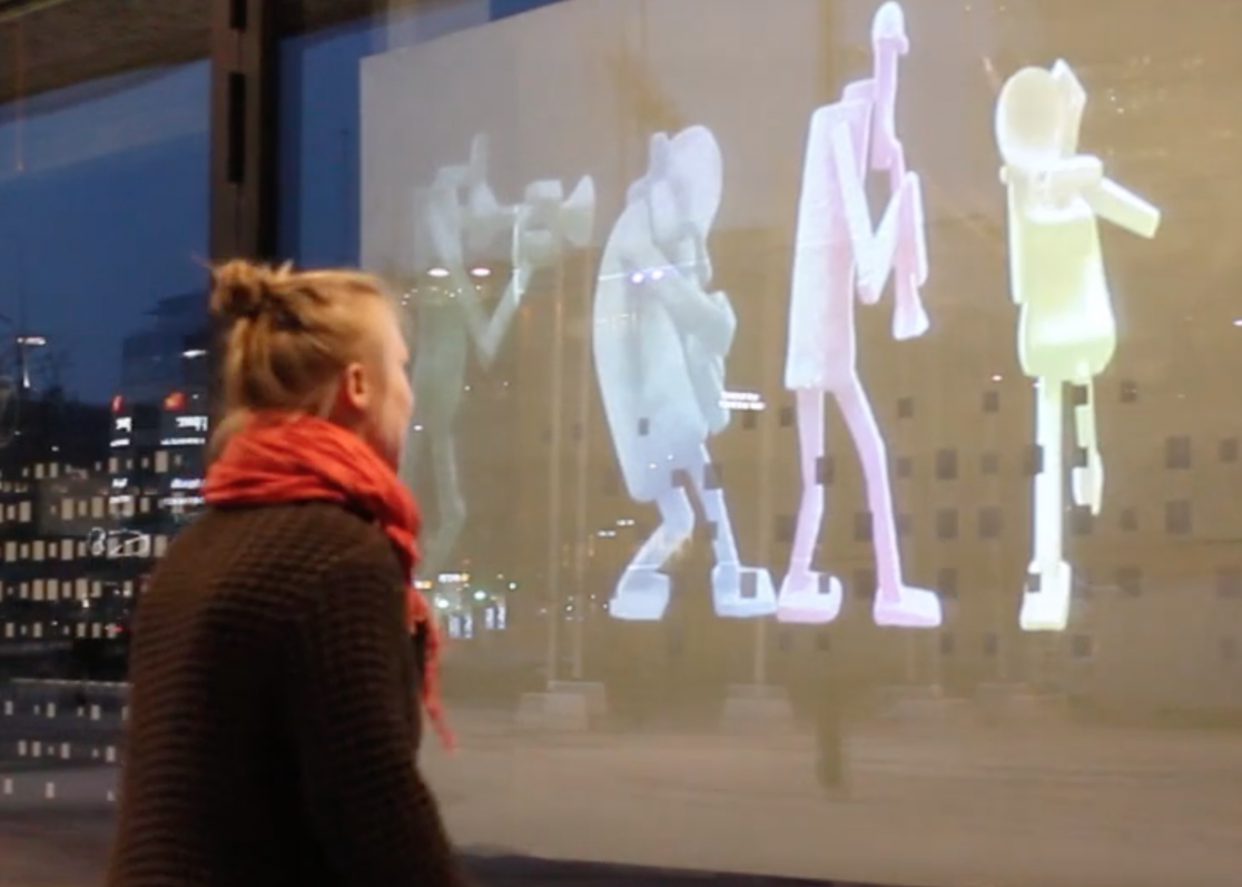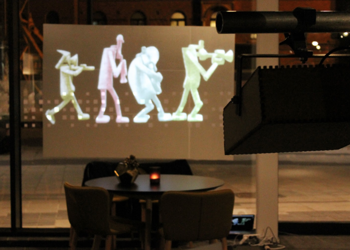Awaken Optimistorkestern is a place-specific toy for adults. It has been designed for a public outdoor area at a newly build concert house in Malmö Sweden, called Malmö Live. The design was inspired by the most photographed sculpture in Malmö, Optimistorkestern by Yngve Lundell. The sculpture consists of four musicians, a trumpet, tuba and oboe, and a conductor and stands in the city centre of the Malmö, Sweden. The toy is a projection of the marching musicians on the windows of Malmö Live. As the public walks in front of them, the musicians turn to the public and release a note.