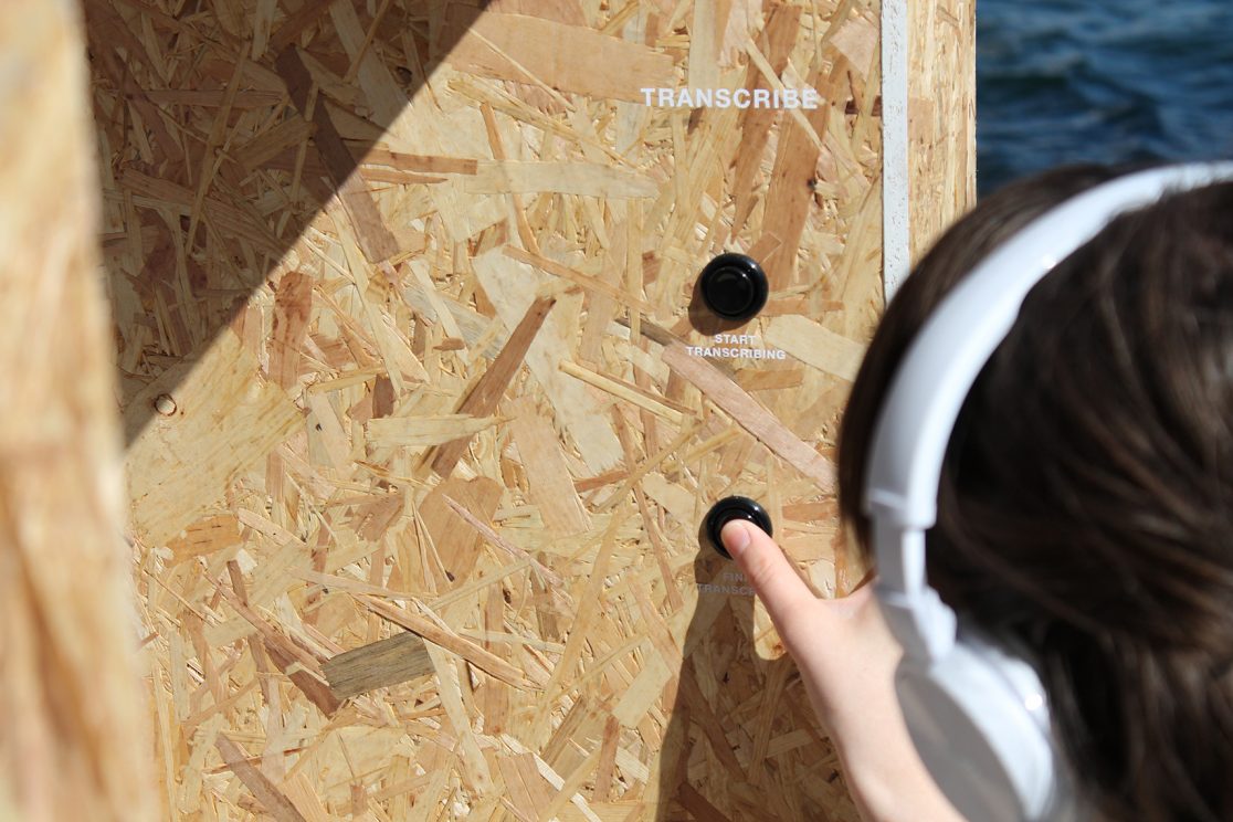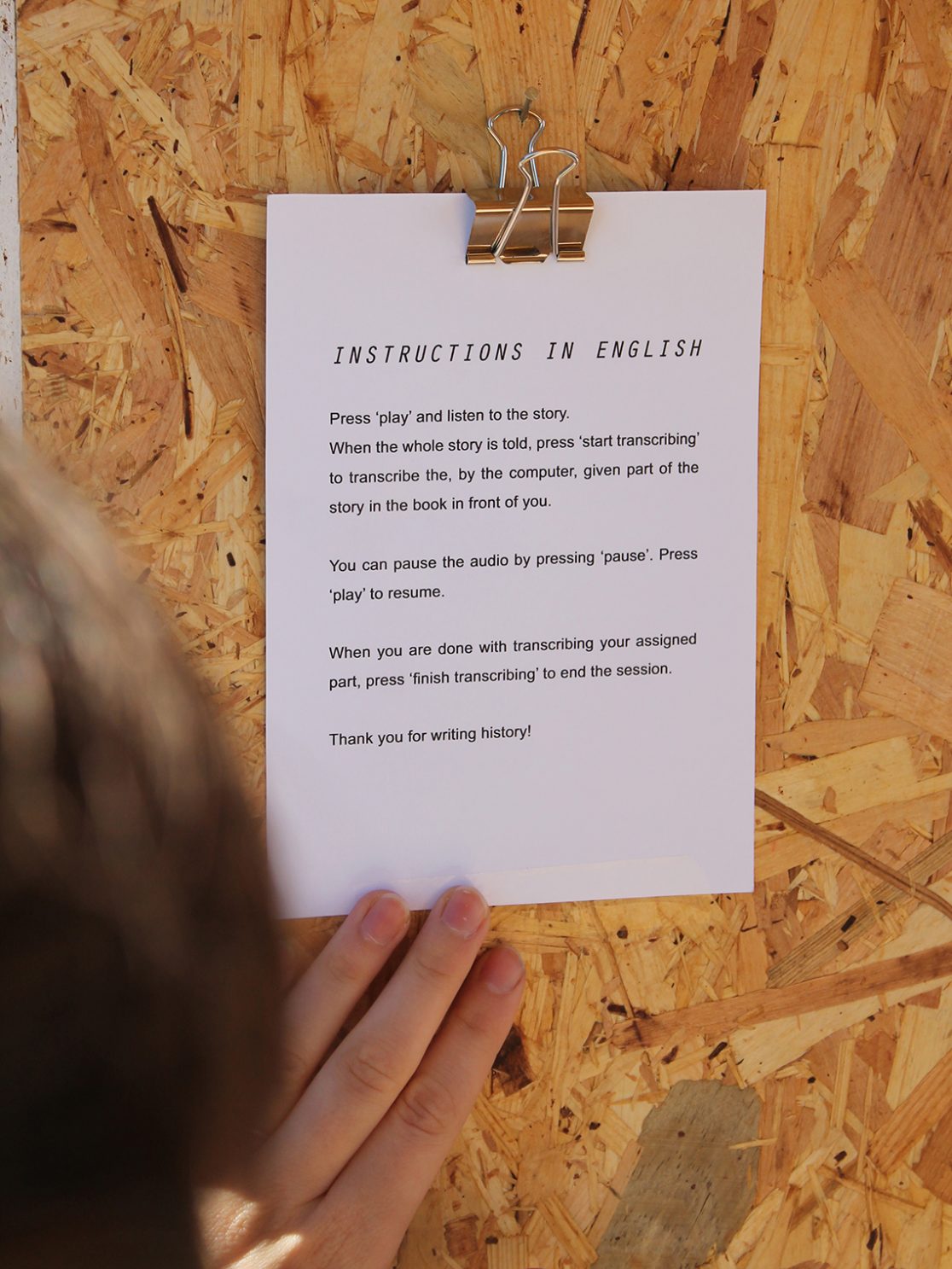 The interactive working station is placed at public places in Malmö. The passers-by are asked to listen to the story of an immigrant woman and write a fragment of the story in a handcrafted book. While writing a fragment of the story, the users’ hand is filmed and then a video is generated.