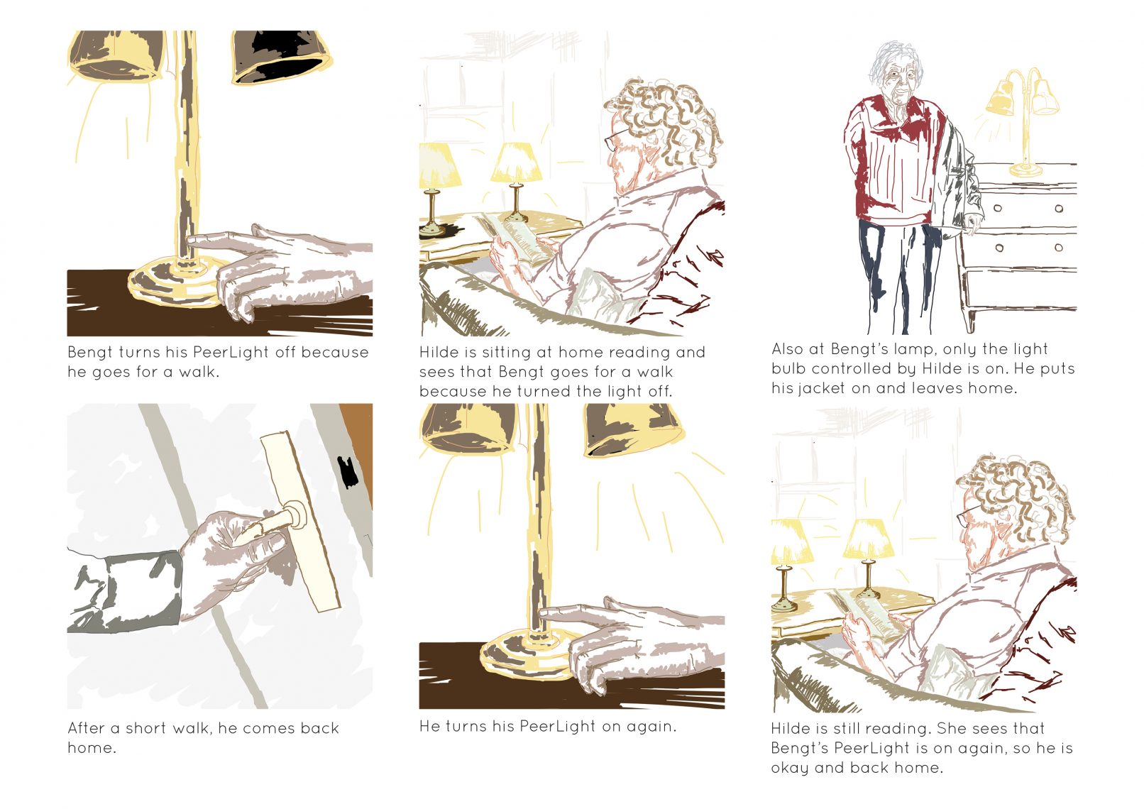 Using findings from fieldwork and literature-focused research, I developed two scenario-based service designs, PeerRadio and PeerLight, with the aim to create these moments at home in elderly people’s everyday lives.